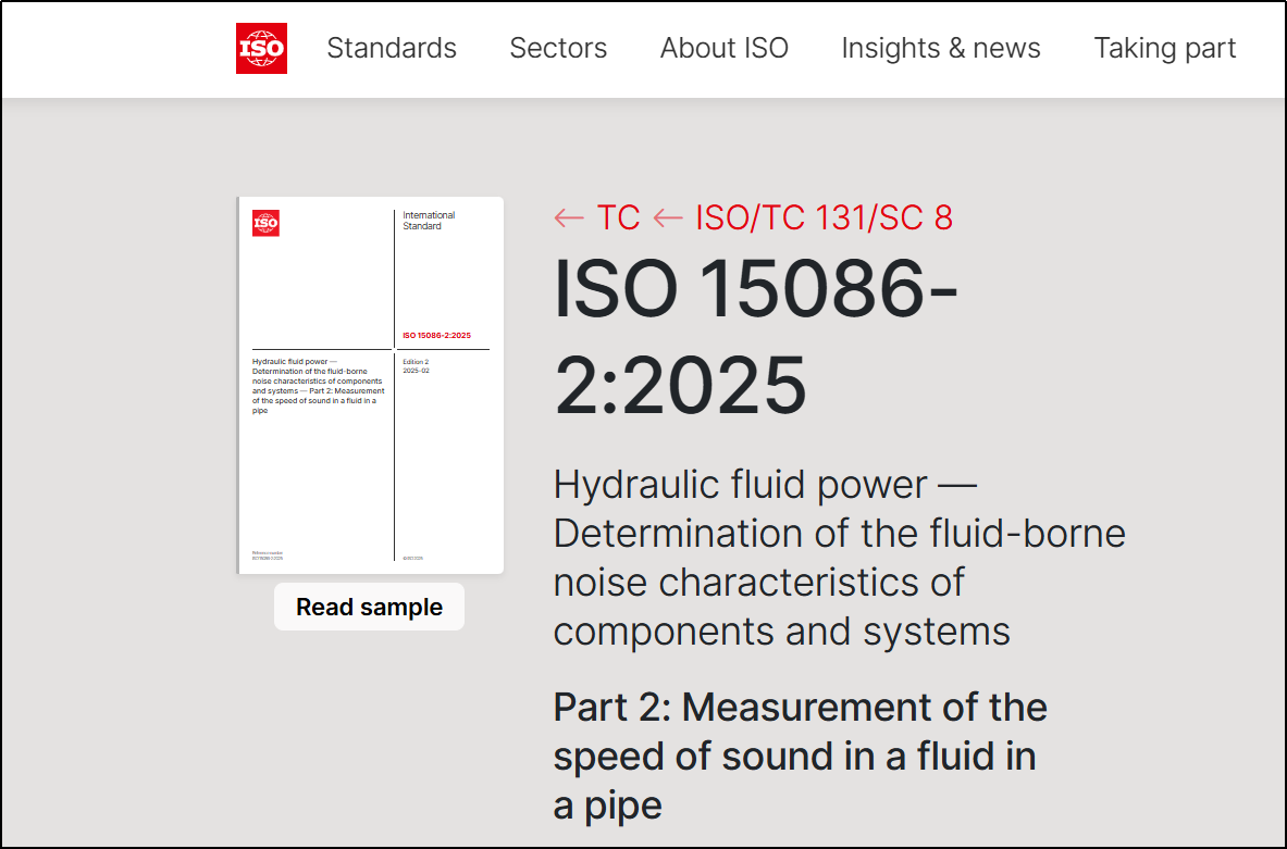 近日,根据国际标准化组织ISO的通告,ISO 15086-2:2025《Hydraulic fluid power — Determination of the fluid-borne noise characteristics of components and systems — Part 2: Measurement of the speed of sound in a fluid in a pipe》(液压传动 油液噪声特性测定 第2部分:管道中油液声速的测量)正式发布。性爱影片