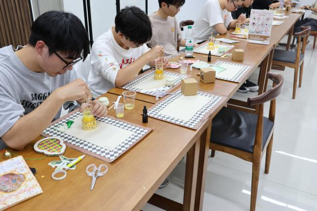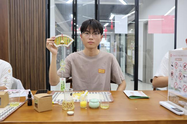 材料台上,桂花干、天然蜂蜡、植物精油依次排开,像一列等待检阅的“秋日方阵”。陈恩婷老师先带大家“识香”——辨桂花品种、讲精油萃取;再示范“调香”——加热、倒模,一整套动作行云流水。最后,他公开独家“最佳配比”,让同学们手握“黄金配方”,放心大胆地把秋天锁进小小盒中。