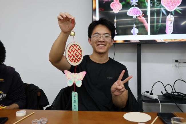 课堂中,陈恩婷老师首先将竹编风铃套装一一分发到同学手上,并详细介绍了非遗竹编风铃的历史和寓意:“竹篾为骨,清风作弦。竹编风铃以千年非遗技法编成,一挂一摇,便能把人瞬间带回山林深处的静谧。它不仅是国家级非物质文化遗产的‘活标本’,更把‘祈福纳吉、平安团圆’的美好寓意编织进每一道缝隙。风过铃响,是清廉自律的提醒,也是自然宁静的召唤;声声入耳,更是我们对美好生活的共同向往与情感寄托。”